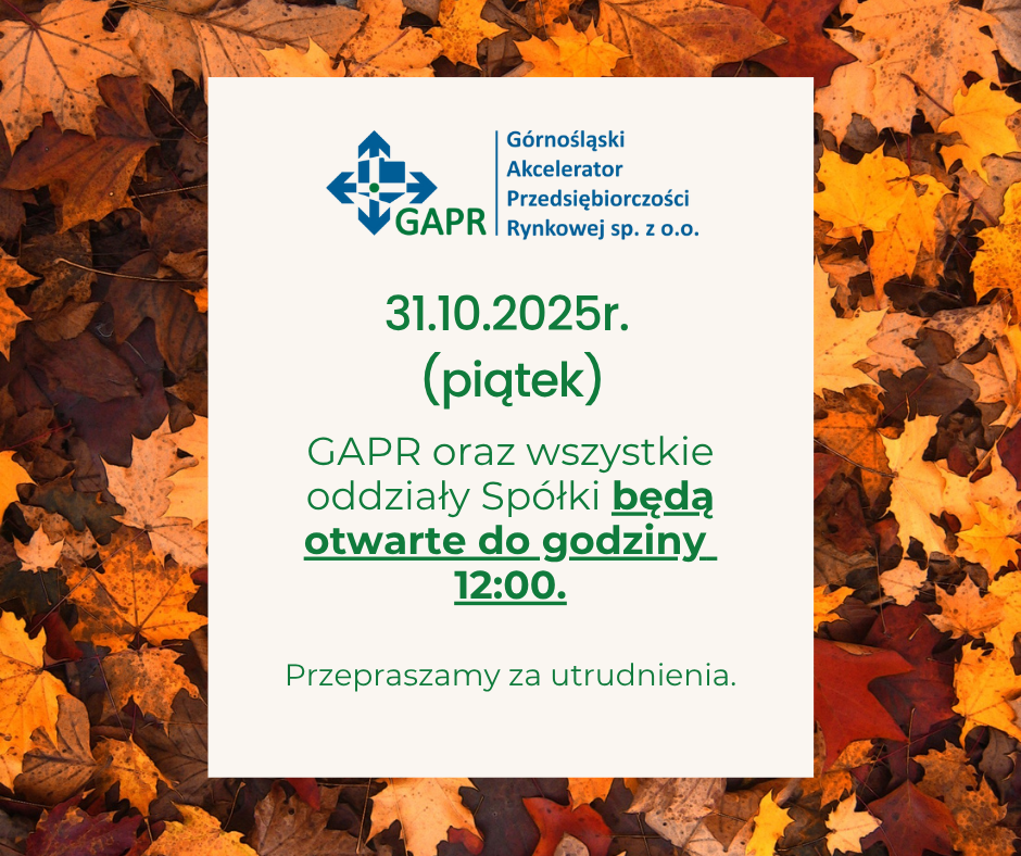 W dniu 31 października wszystkie oddziały Górnośląskiego Akceleratora Przedsiębiorczości Rynkowej będą otwarte do godziny 12:00.Przepraszamy za ewentualne niedogodności.